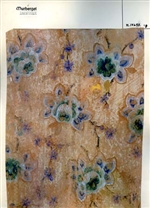 G) Trefärgstryckt fabrikstapet på gulrosa papper, blommönster i vitt, grönt och blått. Klistrad på A4.