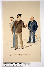 11/ På bilden tre män till hälften vända åt vänster. I förgrunden en sprättig man, käppen svängande i höger hand. Blaserat uttryck, hatt med låg kulle, brun kavaj, rutiga byxor. Till höger bakom honom en spänslig man, blå kostym, med anteckningsblock i hand. I bakgrunden till höger, korpulent man i blå kostym. (Konstnären själv?) Under personerna: "Konstutställningen."