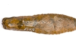 Flintdolk, av gulbrun flinta. Lancettformigt blad. Kraftigt välvt handtag.