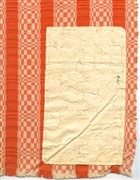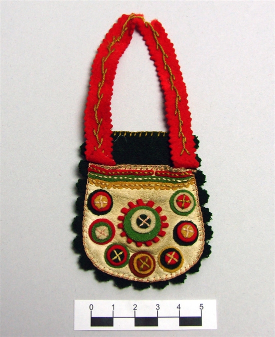 Väska, till docka. Platt väska att hänga. Framsida av vitt skinn med applikationer av cirkelrunda och remsor av filtad ylle, kläde i olika färger. Baksida av ett stycke grönt kläde med uddklippt kant. I överkant fäst band av rött kläde med uddklippt kant samt gulgrönt broderi med kråksparkstygn.