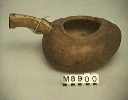Mjölkningskärl, av trä, med skaft. Urholkad i ett stycke, rund form. Tillplattad, halvsfärisk, uppifrån sett nästan hjärtform, sett från sidan är den främre delen lägre än den bakre, (skaftdelen). Runt öppningen en 1cm bred fals. Längre ner tre parallella, symmetriska linjer i ring. På ömse sidor om öppningen i linje med skaftlinjen markerad upphöjning som avslutas i kärlets främsta del i en uddliknande form. Även falsen har tvåuddliknande upphöjningar. Skaftets form böjt och vinklat uppåt, ovalt i genomskärning samt profilerat på ett ergonomiskt sätt. På ovansidan en dekorerad hornplatta, fästad med tre metallspikar. Dekoren typisk för Jokkmokks- Arjeplogsområdet. I skaftets början markerad plats för pekfinger. Skrivet på sidan med penna: Nils And. "Bassam Maras . . ???. . Västerfjäll 1800". Inristat på skaftets ända A. Hela kärlet rödfärgat. Skaftet urholkat under hornplattan och innehåller ett tiotal metallbitar.