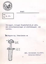 Fästet och en del av klingan funna av handl. M. E. Bodén. (Jmf. Petersen fig. 72). (M 1845?). (Ur liggaren).