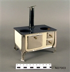 Bindmössa i mörkblått siden med nackrosett och broderat stycke i tyll. Mössa och stycke beskrivs var för sig som inv.nr 3173:1 Bindmössa och inv.nr 3173:2 StyckeInv.nr 3173:1Bindmössa i mörkblått siden och foder i blekt linneväv. Framtill smal med rundad form kring en snibb och grunda sidveck. Dekorationssömmar i två rader längs den i stommen upphöjda kanten. Rosett med dubbla öglor. Fodret endast fäst i mössans kanter. Mössan är mjuk men har tunn limmad pappstomme. Fodret något solkigt i nacken. Mössan har förvarats olämpligt och är något missformad. I nacken finns ett bomullsband med text i svart: "Ångermanl. Hsfören."Mått: längd 180 mm, bredd 125 mm, höjd 80 mmRosett längd 195 mm, bredd 40 mmMössan sydd att bäras till de kvinnliga sockendräkterna i Ångermanland.