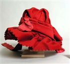 Vävprov i plattväv. Varp i halvblekt lingarn och inslag i mörkgrönt, orange, brunt, rött, svart och lila ullgarn, grönt och brunt sammanspolat ullgarn, rött sammanspolat ull- och lingarn, brunt sammanspolat ull- och lingarn, halvblekt lingarn. Mönstret består av rutor i olika färger. Väven har två stadkanter, i övrigt ofållad.