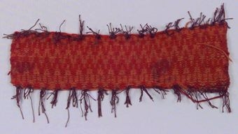 Vävprov i bunden rosengång. Varp i brunt ullgarn och inslag i rött och orange ullgarn. Provet har en ca 30-40 mm lång knuten frans längs långsidorna.