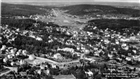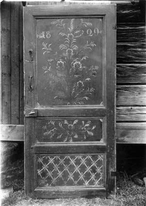 Dörr hos hemmansägare Lars Lundin. Rödbrun bakgrund, blommor i ljust och mörkt grått samt svart, höjd 188 cm, bredd 89 cm.