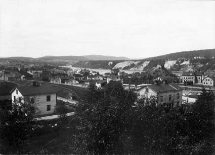Sollefteå med utsikt ett stycke uppåt Ångermanälvens dal. Man ser brant nipstrand på älfvens norra sida, dels täckt af vegetation, dels blottad, och ovanpå en hop byggnader för Norrlands trängbataljon. Körbron öfver älfven synes äfven och på den hitre sidan den isolerade nipan "Borgen". Fotografiet köpt i Sollefteå i augusti 1903.