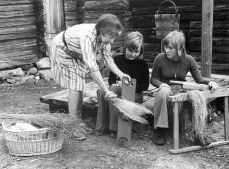 Elever ur klass 8, Franzénskolan, lär linberedning på Murberget.Lineet häcklas till vänster och drages i en draga. En "knippe" - steg - lin ligger ovanpå strykorgen. Stry = avfallet, det sämsta linet.