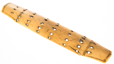 Rätt svar i tävlingen Gissa grejen i februari 2013. Den samiska textila slöjden är ofta dekorerad med tenntrådsbroderier. Dragskivan användes för att bearbeta tennet till tunna trådar. Med hjälp av spinnkors eller slända spanns sedan tenntrådarna kring en tunn sena eller en grov sytråd.