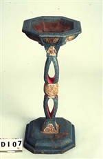 "Dopfunt. Trä. 8-sidig. Å skålens undersida och det 4-sidiga, genombrutna och med kula å mitten försedda mellanstycket snidade bladornament. Blå bottenfärg, de flesta bladornamenten och den med fjällornering försedda kulan i förgyllning. Mellanstyckets genombrutna partier i rött. Å skålens överkant snidat sicksacksband. H. 83 cm. Omkr.1700. Dep. fr. Vibyggerå k:a Ångermanland." (ur lappkatalogen)