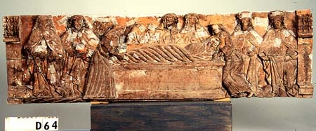 "Kristi gravläggning. Träskulptur. Kristus i sveplinne och 9 st apostlar. Vid sidorna strävpelare och gotiska ornament. Färgrester av guld, silver, blått, rött. Har antagligen utgjort ett predellaparti. H. 42 cm., br. 146 cm. 1500-talets början. Från Gudmundrå k:a Ångermanland. 1912." (ur lappkatalogen)