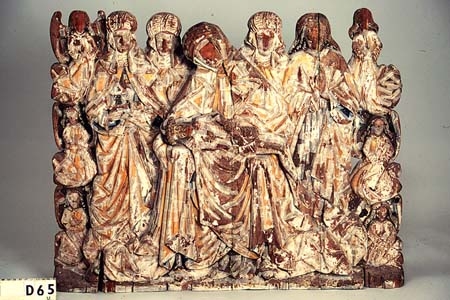 Träskulptur utformad som halvskulptur, har troligen utgjort en central del i corpus till ett altarskåp. Altarskåpet saknas men skulpturen sammanhör troligen med D 64, Predella från samma kyrka. Maria med åt sidan böjt huvud sitter med törnekrönt och blodbestänkt Kristus i knät. Till vänster står ett kvinnligt helgon och Magdalena med smörjelsekar samt tre mindre änglar över varandra. Till höger står ett kvinnligt helgon och Johannes Evangelisten samt tre mindre änglar över varandra. Klädedräkter, mantlar och Marias dok är förgyllda med blå insida. De kvinnliga helgonen har vita turbaner. Marksockeln är grön.