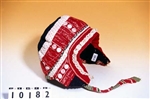 Lappmössa för kvinna. I form av hätta. Nackstycke av mörkblått kläde. I övrigt i huvudsak av rött och vitt tyg. Framtill veckad spets. L. c:a 22 Br. ca 24.