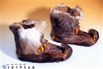 Lappsko till Jukkasjärvidräkten av mörkbrunt skinn med påsydda klädesränder och tofsar i rött och gult.