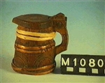 Stånka. Av barrträ. Liten. Laggad. Med två vidjeband. Målad i rött, grönt och svart, halvcirklar m.m. Å locket blomsterornament. Konisk.