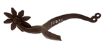Sporre, s k trissporre, av järn, 14,5 cm l. En skänkel avbruten. Skänklarna har triangulärt tvärsnitt och är böjda uppåt. Halsen är vinklad nedåt. Trissan har åtta romboida pikar.