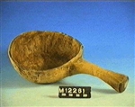 Skopa, av furu. Täljd. Oval med skaft på ena långsidan. L 39,5 cm, B 25 cm, H 8 cm.