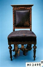 Raka, svarvade framben och fyrkantiga, något utåtsvängda bakben. En rak sarg. En stoppad sits och rygg klädd i ett mörkbrunt skinn. Skinnet är fäst med skinnband och grå metallnitar. Något bakåtlutat ryggparti har profilerad nedre tvärslå, raka ryggstolpar med svarvade halvkolonner samt ett överstycke som består av nedre profilerad list, ett sex centimeters brett parti med en snidad geometrisk utsmyckning och överst profilerad fris. Stolarna har tidigare stått i direktionsrummet.