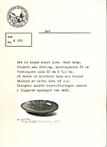 Fat av bränd svart lera. Runt bräm. Försett med fotring. Mynningsdiam 22 cm. Fotringens diam 12 cm, H 3,5 cm. På fatet en klistrad lapp med texten "Tallrik af bränd svart lera. af E.G." Tidigare omärkt identifieringen osäker i liggaren upptaget som skål.