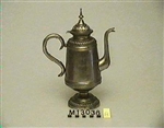 Kaffekanna, med lock (trasigt) av förnicklad metall. Mönstring runt kannans fot samt övre del. Locket har fått en egen fasonering.