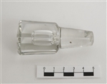 Karaff, av glas, etsad text: Old Whisky. Stjärnslipad botten. Flaskans axelparti olivslipad. Slipad glaspropp.