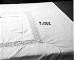 Påslakan, med ovalt urtag mitt på. Spets runt öppningen med mönster av åttuddig stjärna. Vit bomullslärft. Gåva: konsul Ramström, Härnösand. (Ur lappkatalogen).
