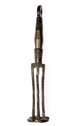 Nyckel, av brons. L. 10,4 cm. Sannolikt vikingatid. Medeltid. Halva skaftet är runt medan nederdelen är delad i tre stavar som slutar i ett runt ax, diam. 2 cm, med fyra urtag runt kanten och mitt i ett runt och ett rektangulärt urtag. Mittstaven bruten. Dekor av ristade, diagonala linjer. Okänd fyndort. (Ur lappkatalogen).