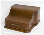 Skrivmaskin, stående på platta av ek, med huv av ek. 38 x 36 cm. H. 19 cm.