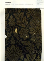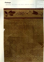 A) Tvåfärgstryckt fabrikstapet på brunt papper. Mönster av blad i papprets färg med markering i gult av vågräta och lodräta streck, mellan mönstret mörkbrun botten.