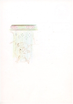 Tapet, underifrån räknat. Enfärgstryckt fabrikstapet på gulbrunt papper. Mönster av spridda blomkvistar inom ovaler i papprets färg samt lodräta streck, mellanrum i ljust blågrönt. Bård, bredd 4,5 cm, gulbrunt papper, med näckros i papprets färg, med röd och vit markering, mellanrum i grönt. Jugend. Klistrad på A4. (Ur lappkatalogen).