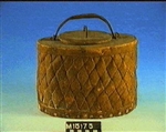 Mjölkbytta, fllätad av näver med botten, översida och lock av trä. Handtag av järn. Oval diam. 30 x 20 cm. H. 19,5 cm. Lockets diam. 16 cm. med järnhandtag.
