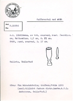 Kaffemortel med stöt. Morteln konisk på in- och utsidan med yttersidorna svagt konvexa. Avslutas nedåt med några profileringar och övergår i en låg, något breddad fot. Ornerad vid mynningen med dubbla svarvade streck. Inuti avslutad i smal rundad botten. Stöten avslutas i ena änden med en rund, tillplattad knopp och i den andra med en, något trubbig, spets. Stöten är betydligt kortare än mortelns innermått. Eventuellt ej ursprungligen sammanhörande?