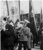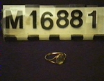 Ring, av guld, med infattad kassett, täckt av konvext glas. I kasetten, 3 mm hög, 8 mm diameter, finnes en 7 mm lång hårfläta i miniatyr, som vilar på en vit textilbotten. Ringbygeln, 19 x 1 mm, består av två sammanlödda trådar, vilka vid kasettens fästen förgrenar sig. Under kasetten är stämplat: 18K, F4, och en oläsbar tillverkarstämpel. Gåva: fröken Kerstin Holmberg, Bromma. (Ur lappkatalogen).