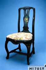 Raka och balusterformade bakben. Utsvängda i s-form framben är prydda upptill med fjällornament och avslutade vid fötterna med tassar. Ett svarvat h-kryss förenar benen. En rak sarg är svängd fram och avrundad på sidorna. Sitsen är lös, stoppad och klädd i ett ljust linnetyg med röda blommor och gröna blad. Ryggstödet består av raka ryggståndare och ett mjukt avslutat överstycke. en balusterformad ryggbricka med en genombrytning upptill i form av ett förstorat nyckelhål. En påklistrad blomsterdekor finns under genombrytningen på ryggbrickan. Stolen är svartmålad.