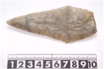 Spjutspets av gråvit kvartsit. Slagen och knackad. Rombisk med spetsovalt tvärsnitt. Tjockast bakom udden. Baspartiet avslaget. L 10,8 cm B 4,8 cm Tj 0,9 cm.Funnen 25/7 1967 av Nils Eriksson i Ramneå på dennes ägor Ramneå 1:32 på botten av Ramnån ca 150 m sydväst om bostadshuset.