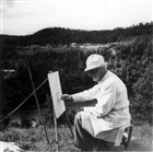 A) Oljemålning på duk inom ram. Motiv från Ångermanälven. Till vänster syns ett rödmålat staket och till höger en vit mangårdsbyggnad med en vindflögel och en flaggstång med unionsflaggan hissad.