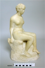 Skulptur av vit marmor. Naken kvinna sittande på stenblock. Signerad på "stenens vänstra sida: "Frisendahl". Här är även rsitat bokstäverna: "TIANI" (?).