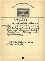 Lykta, av genombruten bleckplåt. Cylindrisk med konisk överdel. Enkel cylindrisk ljuspipa. Dörr med stänganordning. Järnögla för bärning och upphängning.