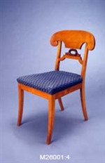 Fyrkantiga och något utsvängda ben. Sargen är rak. sitsen är stoppad och klädd i ett blått tyg med ett vågigt mönster i svart. Ett möbelband går runt klädseln. Ryggen består av fyrkantiga och raka ryggståndare, ett sköldformat överstycke och en liggande bruten ryggbricka. en snidad oval krans finns mellan ryggbrickan och överstycket.