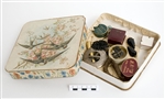 Ask innehållande bl.a. 1st brosch med svarta slipade glasbitar, 1st trasig avlång röd brosch, 1st litet silversmycke med ett hjärta och ett oläsligt namn inristat, 1st brosch, silver med G inristat, 1st fällkniv i form av ett kvinnoben.