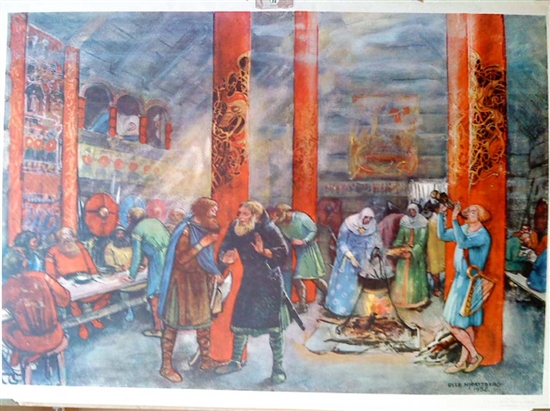 Skolplanschen med titel: Fornnordisk Gäststuga.