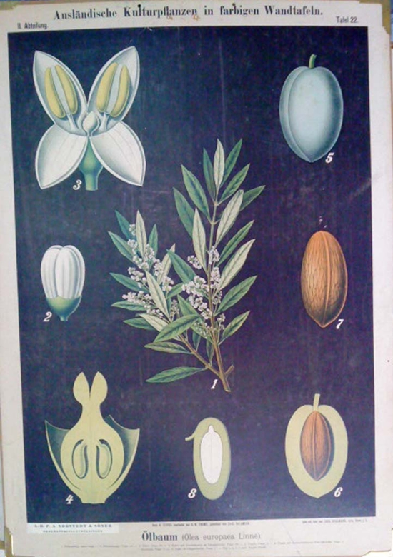 Skolplanschen med titel: Ausländische Kulturpflanzen in farbigen Wandtafeln Ölbaum: Olea eruopaea Linné)