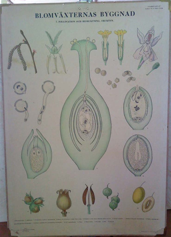 Skolplanschen med titel: Blomväxternas byggnad pllination och befrukning. frukten.