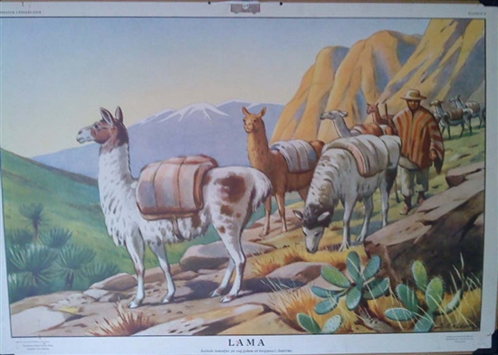 Skolplanschen med titel: Lama lastade lamadjur på väg genom ett bergspass i Anderna.