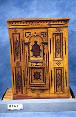 Ståndskåp av barrträ, i renässansstil. En dörr och speglar på sidorna samt på dörren. Dörrspeglarna äro två: den övre avlång med rundbåge överst och avsats vid sidorna. Skåpet har rakt ovankant, krönlistan har upptill avlånga, gröna bladformiga utskärningar med röd knopp i mitten och därunder en rad urtagningar av vidstående form: gul färg med svarta målade figurer /rankor, stavar m.m./. I dörrspeglarnas mitt röda fält med svart inramning och röda spegelkanter.