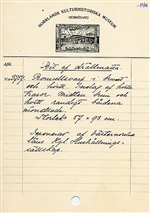 Bit av matta, inslagsrips i brunt och vitt, inslag av bomullstråd och trasor. Mittpartiet randigt på längden. Bårder av stjärnor. En kortsida fållad på maskin, en kortsida langetterad.