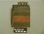 Ask, av granträ, på låga fötter. Skjutlock med utskuret, tredelat handtag. Sidor och lock täckta med ristade och uddsnittsornament. Blågrön färg och röd bård mitt på sidorna runt om. Höjd 17 cm, bredd 10 cm, längd 13 cm.