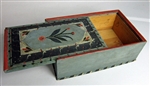 Skrin, av barrträ, med skjutlock, sinkad samman i hörnen. Botten fäst med tränaglar. Gråmålat med svart-vita snedband på kanten nertill och röd kant upptill. Locket är utskuret med reliefspegel, med låg, platt relief överst, spetsigt formad vid kortändarna. Ornament: svart ram med vita och röda snedband, därinnanför rödgröna blad på vit botten samt på mittpartiet blomster i svart, grönt, rött, vitt på grå botten. Längd 24 cm, bredd 15 cm, höjd 8 cm. Undertill är skrivet med blyerts: 1818. Målning på locket.