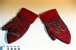 Vantar, av röd vadmal, tumvantar, fodrade med skinn, broderade med fint silke en stjärna mitt på i gråblått och gult, dessutom ett par stjärnor, trianglar och ränder runt om tumfästet. På insidan av vanten är sprundet för fingrarna hopsytt. 27 cm långa.