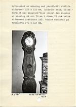 A) Golvur, av barrträ. Mjukt svängda konturer. Två lösa delar: urverksfodralet och nederdelen. Nederdelen indelad i två partier. Nedersta kanten uppåtsvängd mot mitten med utskärning, (se skiss). De två partierna skiljs av en något svängd, kraftigt profilerad list med två vingliknande, låga reliefer. I övre partiet finns dörren, avlång och fyrkantig med rundade hörn. Ungefär på dess mitt finns ett urtaget hål, ovalt, med veckad reliefbård omkring. Reliefen fortsätts neråt av blomranka och uppåt av man i helfigur från sidan sedd. Se skiss. Detta parti avslutas upptill av kraftig list med profilering och på mitten nerhängande bladknippe. Därunder är ristat: B P D 1846, (senare ristning ?). Överdelen, urverksfodralet är runt med ett brett band av reffling runt omkring med tvärband (även refflade, med gråvit målning). Överst krön av stiliserade bladornament i fri skulptur. Urverk finnes men ej lod. Urtavlan har arabiska siffror, (timmar samt minuter för varje kvart). Märkt A.A.S. Hela klockan är svartmålad i övrigt.